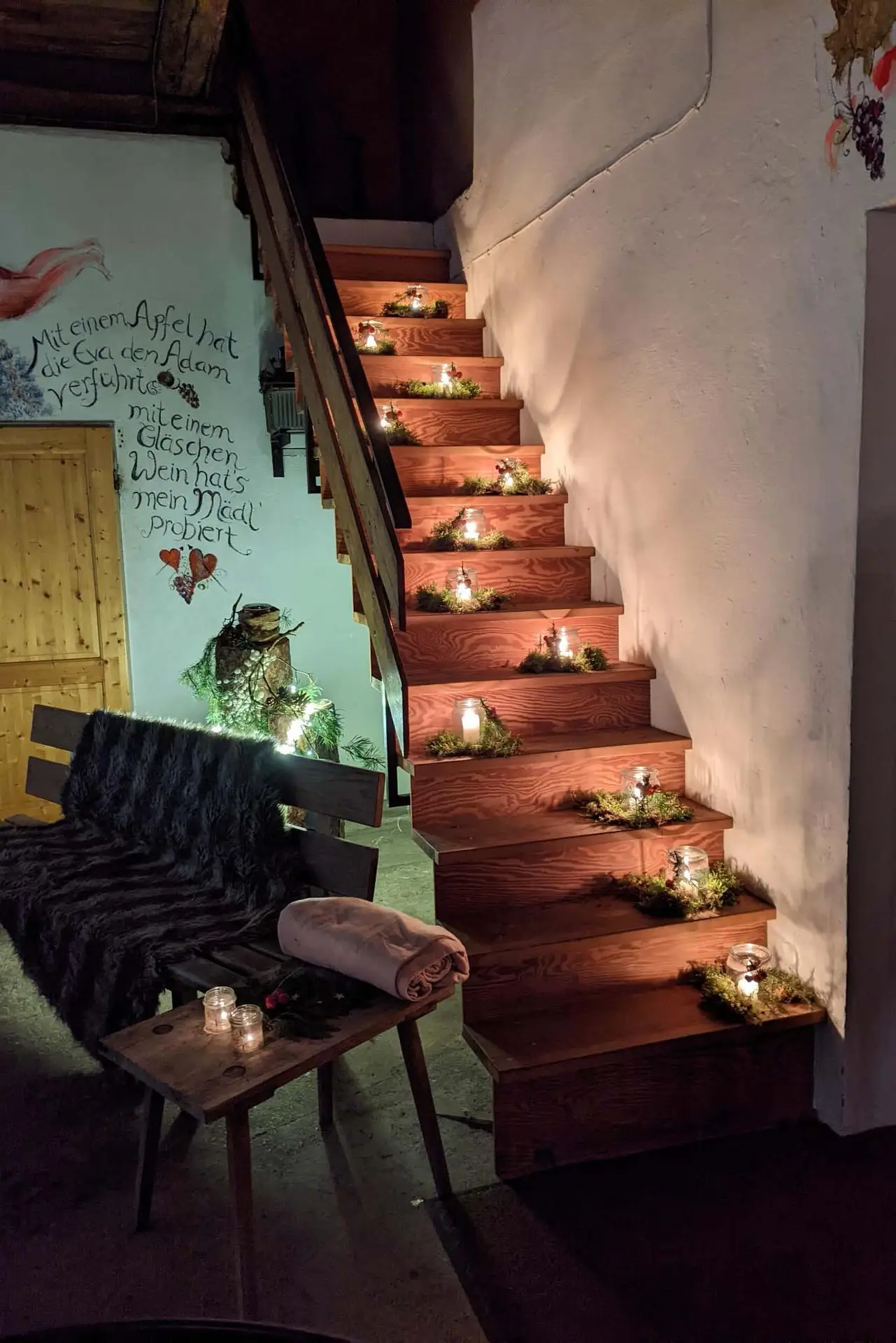 Weihnachtlich geschmückter Innenhof: Unser Hof erstrahlt im festlichen Glanz und lädt zum Ankommen, Verweilen und Genießen ein.